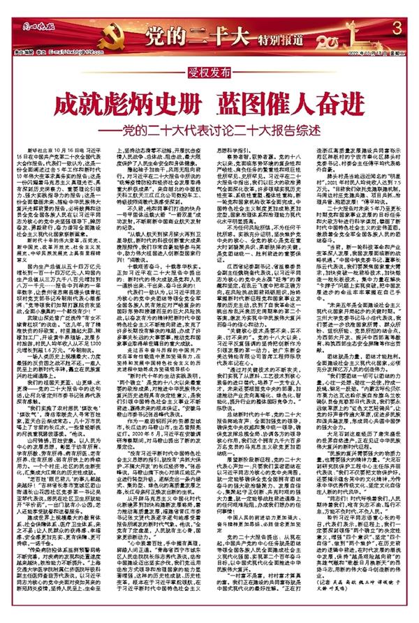 二十大报告对未来5年乃至更长时期党和国家事业发展的目标任务和大政方针进行科学谋划,擘画了新时代中国特色社会主义的宏伟蓝图,激励着全党全军全国各族人民的团结奋斗。