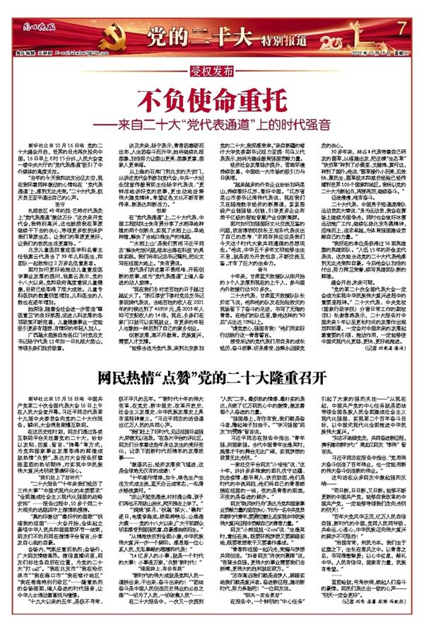 “我所在的单位是获得过56面英雄旗的英雄部队。”入伍15年的孙金龙代表说,这次能当选党的二十大代表他感到无比光荣和自豪。今后他会以加倍的付出,努力捍卫荣誉,续写英雄部队新的辉煌。