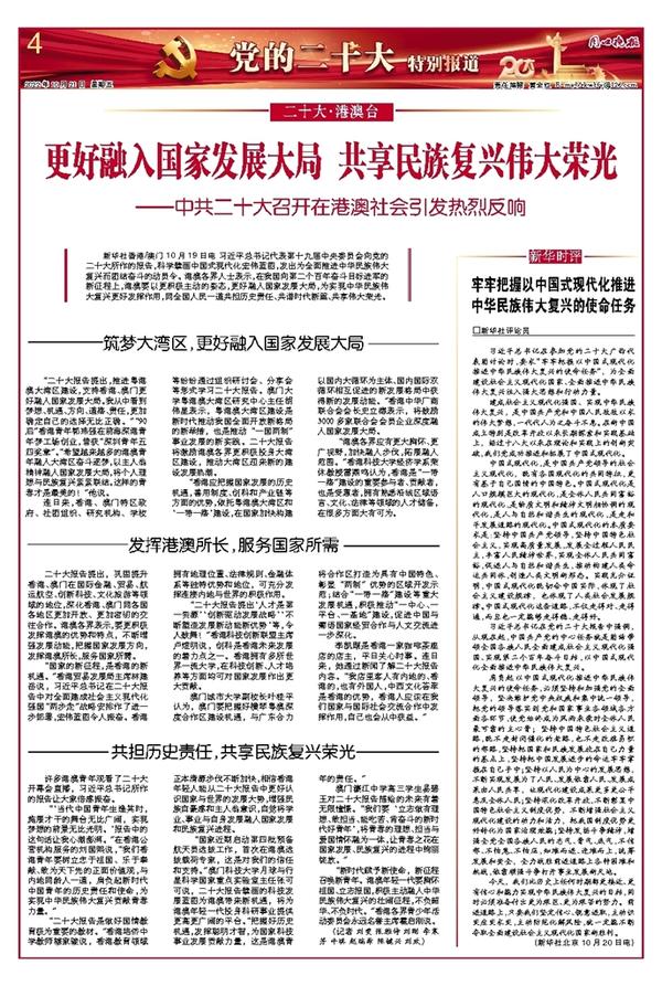 新华社香港/澳门10月19日电 习近平总书记代表第十九届中央委员会向党的二十大所作的报告,科学擘画中国式现代化宏伟蓝图,发出为全面推进中华民族伟大复兴而团结奋斗的动员令。港澳各界人士表示,在我国向第二个百年奋斗目标进军的新征程上,港澳要以更积极主动的姿态,更好融入国家发展大局,为实现中华民族伟大复兴更好发挥作用,同全国人民一道共担历史责任、共谱时代新篇、共享伟大荣光。