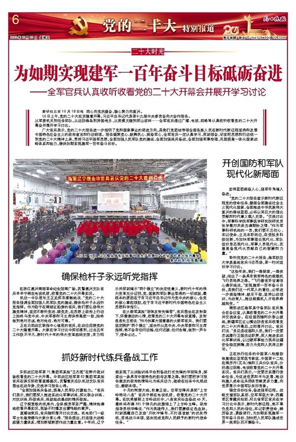 广大官兵表示,党的二十大报告进一步指明了党和国家事业的前进方向,是我们党团结带领全国各族人民在新时代新征程坚持和发展中国特色社会主义的政治宣言和行动纲领。报告凝聚党心、鼓舞民心、振奋军心,全军官兵一定认真学习、深刻领会,切实把思想和行动统一到党的二十大精神上来,贯彻习近平强军思想,全面加强人民军队党的建设,全面加强练兵备战,全面加强军事治理,巩固提高一体化国家战略体系和能力,确保如期实现建军一百年奋斗目标。