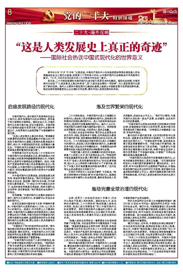 连日来,二十大报告强调的中国式现代化成为吸引世界目光的关键词。国际社会称赞,中国式现代化创造了“人类发展史上真正的奇迹”,是“人类社会发展的一项创举”,为人类实现现代化提供了新的选择。海外人士期待中国在现代化建设的道路上继续以中国新发展为世界提供新机遇,推动全球治理朝着更加公正合理的方向发展,携手开创人类更加美好的未来。
