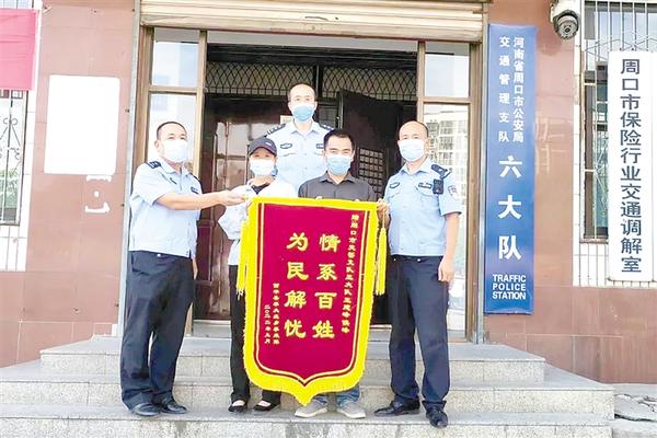 “交警同志,太感谢你们了,感谢你们情系群众,为民服务的精神”。10月21日上午,当事人的侄子师某某将一面写有“人民交警为人民,情真意切暖民心”的锦旗送到该支队五大队,向事故大队民警李斌、曹书伟表示感谢。