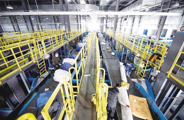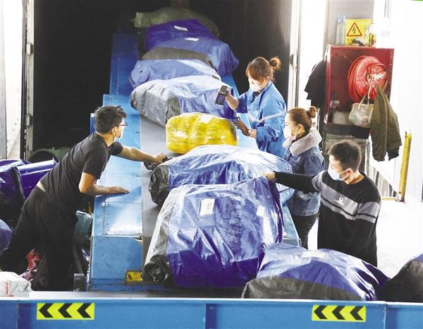 工人将分拣后的快递物品扫码装车送往省内各地