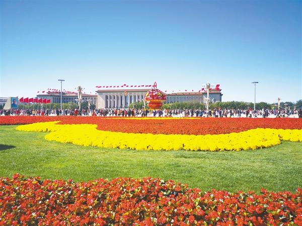 国庆节期间,北京天安门广场上,花团锦簇,红旗飘扬,到处洋溢着喜庆、欢乐的节日气氛,吸引全国各地游客纷至沓来,一睹盛世美景,祝福祖国更加繁荣昌盛。