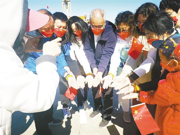 几名游客在手心写下“我和祖国永远不分割”