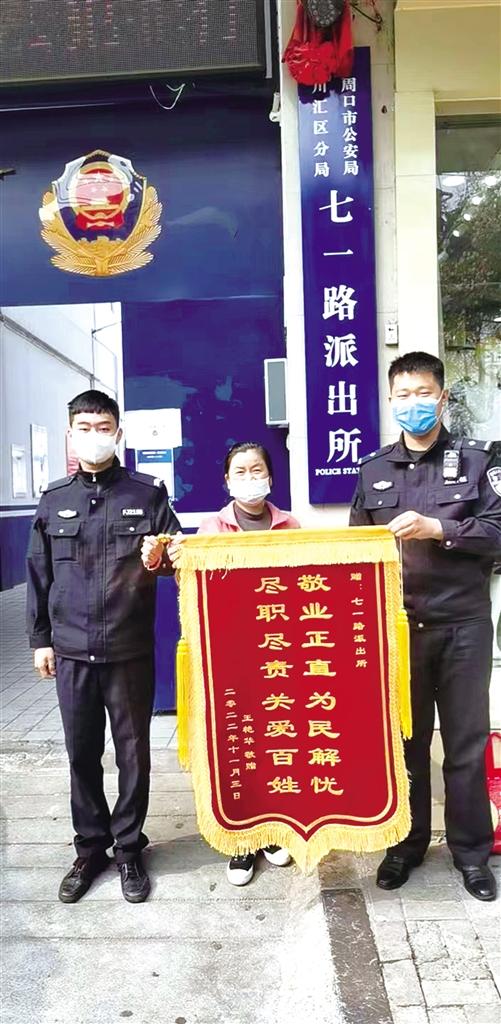 本报讯 “尽职尽责、敬业正直、关爱百姓、为您解忧”。11月3日上午,一面鲜红的锦旗被送到川汇区公安分局七一路派出所海昊宇警官的手里(如图)。简单16个字蕴含着群众对民警工作的肯定与感谢之情。