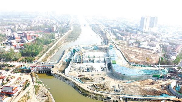 11月3日,记者航拍的施工中的扶沟县贾鲁河北关闸。2021年11月25日,贾鲁河综合治理工程正式开工。作为我省灾后恢复重建的重点项目和标志性工程,贾鲁河综合治理工程总投资74亿元,长度148公里,周口段近85公里,涉及扶沟县、西华县、川汇区三个县区,目前正在紧张施工中,工程完工后,将有力地保障流域内防洪安全。记者 刘俊涛 摄