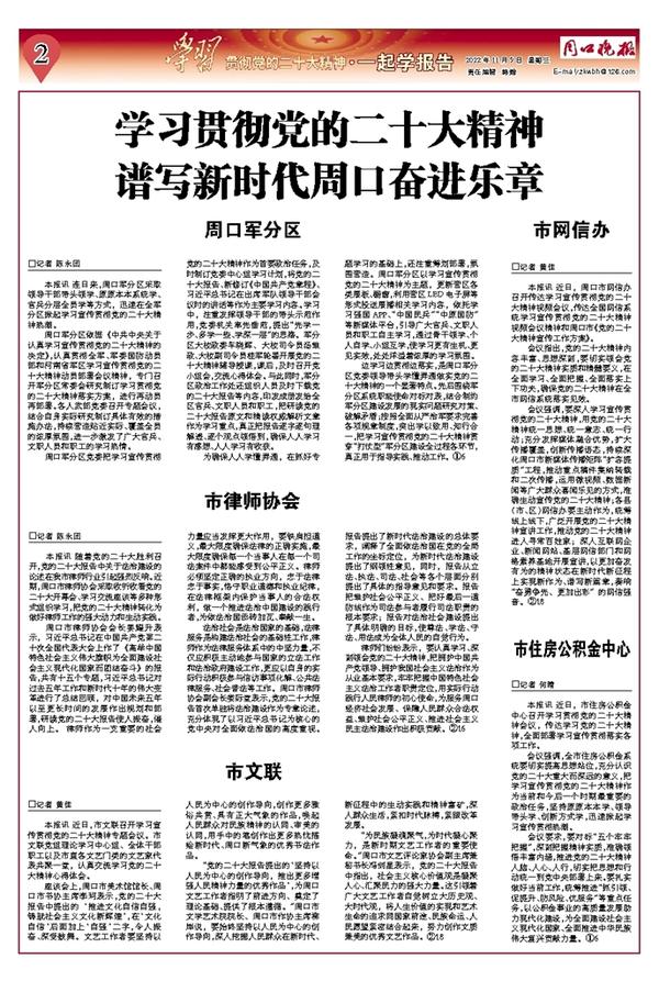 会议强调,要深入学习宣传贯彻党的二十大精神,用党的二十大精神统一思想、统一意志、统一行动;充分发挥媒体融合优势,扩大传播覆盖,创新传播语态,持续深化周口市新媒体传播矩阵“扩容提质”工程,推动重点稿件集纳转载和二次传播,运用微视频、数据新闻等广大群众喜闻乐见的方式,准确生动宣传党的二十大精神;各县(市、区)网信办要主动作为,统筹线上线下,广泛开展党的二十大精神宣讲工作,推动党的二十大精神进入寻常百姓家;深入互联网企业、新闻网站、基层网信部门和网络素养基地开展宣讲,以更加奋发有为的精神状态在新时代新征程上实现新作为、谱写新篇章,奏响“奋勇争先、更加出彩”的网信强音。②18