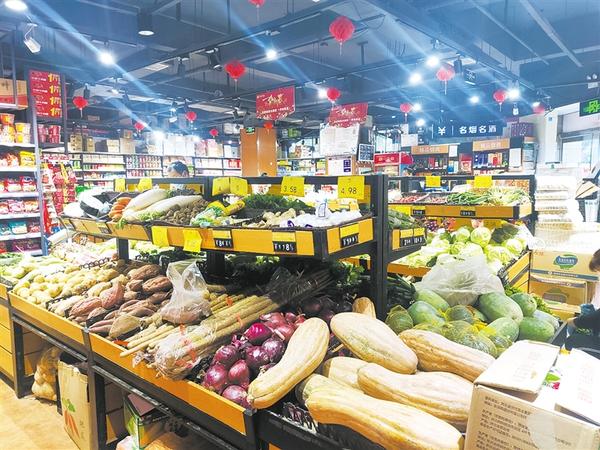 在春艳悦时尚百货超市生鲜区,蔬菜、鸡蛋、肉、水果等物品种类齐全,滚圆圆的青萝卜成堆摆放,不少顾客正在挑选。