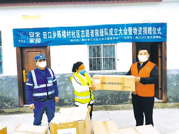 本报讯 为有效提升群众应对突发灾害的反应能力、应急处理能力和协调作战能力,科学掌握防灾避险方法,切实维护人民群众生命财产安全,11月26日,周口市三川社工义工服务中心(三川社工)在西华县田口乡陈楼行政村举行壹基金安全家园项目社区志愿者救援队成立大会暨物资捐赠仪式。