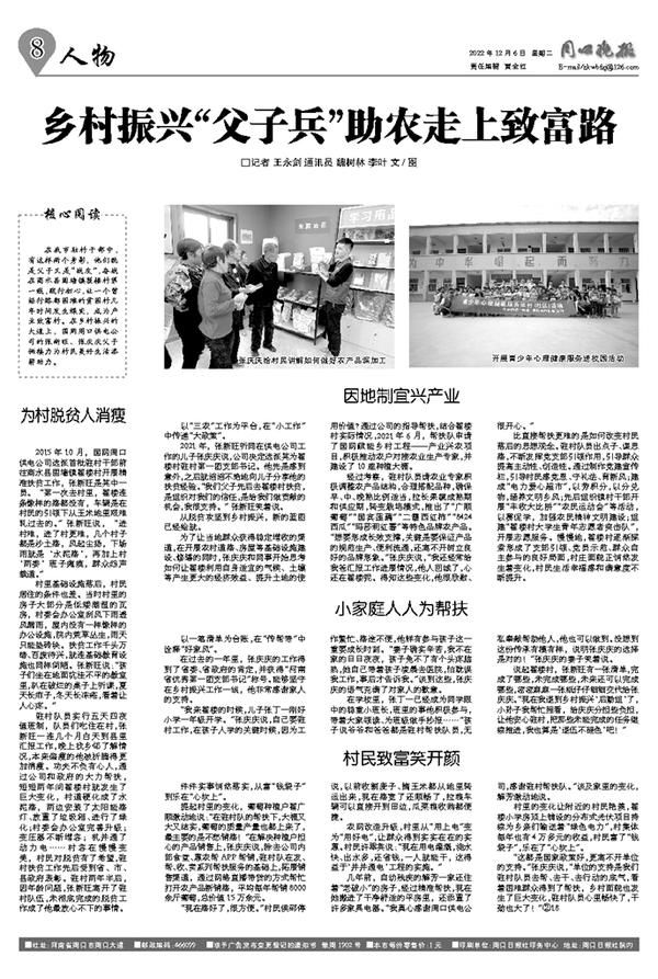 在我市驻村干部中,有这样两个身影,他们既是父子又是“战友”,奋战在商水县固墙镇翟楼村第一线,践行初心,让一个曾经行路都困难的贫困村几年时间发生蝶变,成为产业致富村。在乡村振兴的大道上,国网周口供电公司的张新旺、张庆庆父子俩接力为村民美好生活添薪助力。