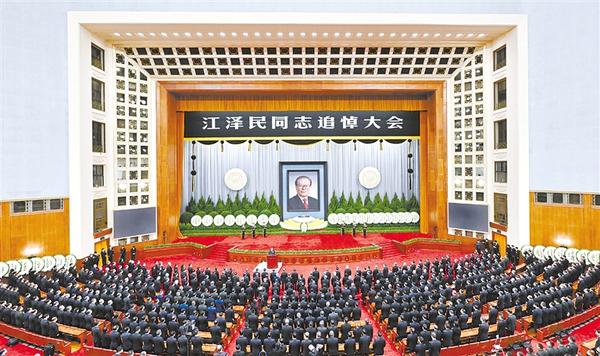 在全场凝重的气氛中,习近平致悼词。习近平在悼词中高度评价了江泽民同志光辉的一生和建立的丰功伟绩。他指出,从党的十三届四中全会到党的十六大的13年中,国际形势风云变幻,我国改革开放和社会主义现代化建设进程波澜壮阔。在国际国内十分复杂的形势下,江泽民同志带领党的中央领导集体,高举马克思列宁主义、毛泽东思想、邓小平理论伟大旗帜,坚持党的基本路线不动摇,紧紧依靠全党全军全国各族人民,坚定不移坚持和发展中国特色社会主义。江泽民同志深刻洞察世界新军事变革的发展趋势,主持制定了新时期军事战略方针,强调要推进中国特色军事变革,坚定不移走中国特色的精兵之路,加强人民军队革命化、现代化、正规化建设。在江泽民同志亲自领导和大力推动下,我国国防和军队现代化建设取得了巨大成就。江泽民同志集中全党智慧创立了“三个代表”重要思想,进一步回答了什么是社会主义、怎样建设社会主义的问题,创造性回答了建设什么样的党、怎样建设党的问题,深化了我们对新的时代条件下推进中国特色社会主义事业、加强党的建设的规律的认识,以新的思想、观点、论断,继承、丰富、发展了马克思列宁主义、毛泽东思想、邓小平理论。