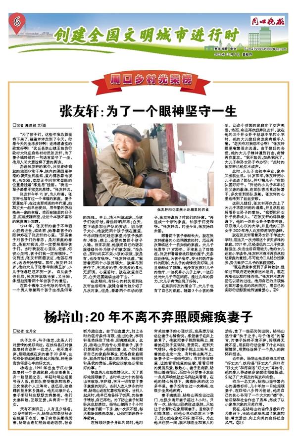 执子之手,与子偕老,这是人们对爱情的美好向往。在扶沟县江村镇姚皂村有这样一位老人,他不离不弃,照顾瘫痪在床的妻子20多年,左邻右舍提起他都竖起大拇指,称他是街坊邻居心中的好丈夫。