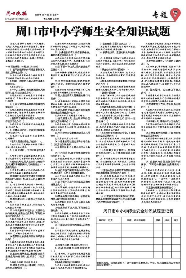 为深入贯彻学习党的二十大精神,提高广大师生及家长的安全素养,持续抓好安全教育,进一步普及安全知识,周口市教育体育局决定从今天开始到12月31日组织开展周口市中小学师生安全知识学习和知识竞答活动。本报刊登50题,每题2分,共100分。