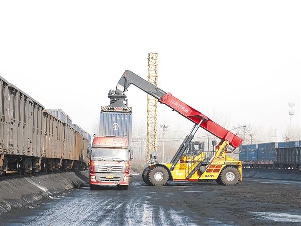 12月16日,沈丘县刘湾港“公铁水”货运码头,一台大型吊装机械正忙着装载煤炭货箱。刘湾港位于沈丘县刘湾镇,毗邻安徽省界首市,现已建成2个300吨级泊位并投入使用,总面积达21万平方米,年吞吐量达500万吨,如今已形成公路、铁路、水路三位一体的联运中转通道。