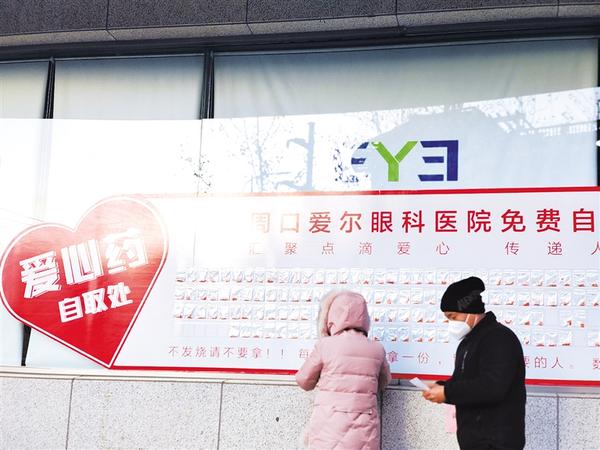本报讯12月22日上午,记者在建安路与育新街交叉口的周口爱尔眼科医院门前看到,这家医院门口的玻璃上贴着一排排药袋,旁边贴着温馨提醒:“发烧者自取,不发烧者勿取,请把退烧药留给最需要的人。”
