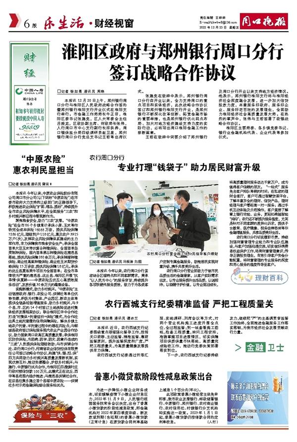 本报讯 今年以来,中原农业保险股份有限公司周口市分公司(以下简称“中原农险”)在市委市政府大力支持和上级部门的正确领导下,积极推进农业保险“扩面、增品、提标”,持续提升全市农业风险保障水平,在全面服务“三农”和乡村振兴新征程中展现新作为。
