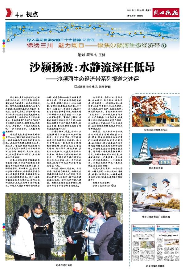 历时两个多月的沙颍河生态经济带系列报道,在12月24日沈丘篇发表后己近尾声。此次战役性报道,周口报业传媒集团投入大量人力物力,通过传统媒体及新媒体,系统性、全景式呈现了沙颍河周口境内160多公里生态带全域建设现状及灿烂图景,让全市人民以及全网受众,身临其境般“见证”并“体验”了沿线的如画风光、独特景观、深厚文化、丰富物产,并忍不住发出感叹——江山如此多娇,引无数英雄竞折腰!