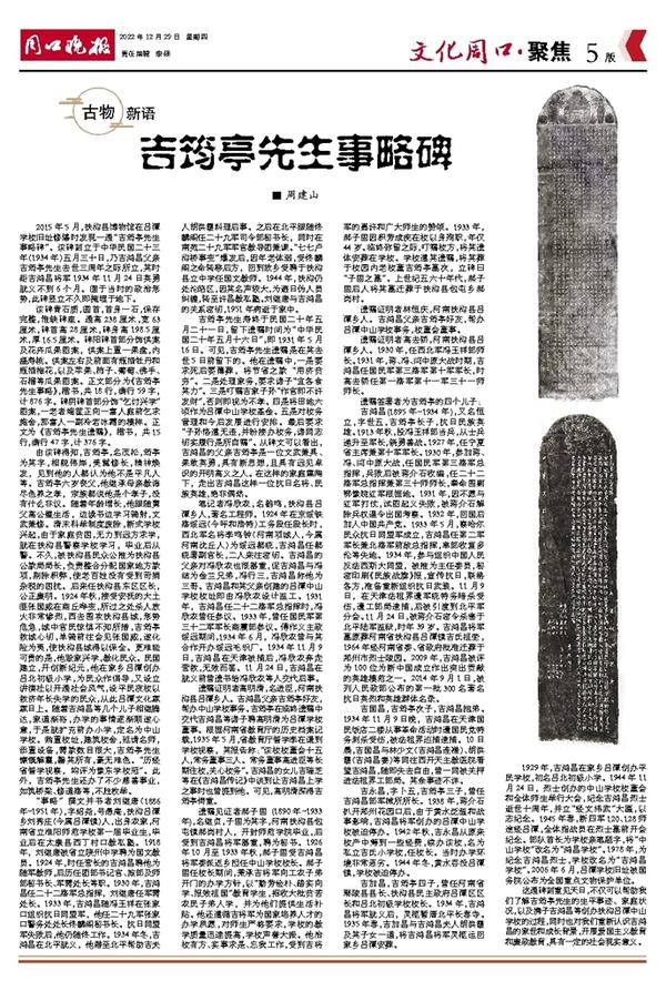 2015年5月,扶沟县博物馆在吕潭学校旧址修缮时发现一通“吉筠亭先生事略碑”。该碑刻立于中华民国二十三年(1934年)五月三十日,乃吉鸿昌父亲吉筠亭先生去世三周年之际所立,其时距吉鸿昌将军1934年11月24日英勇就义不到6个月。囿于当时的政治形势,此碑竖立不久即掩埋于地下。