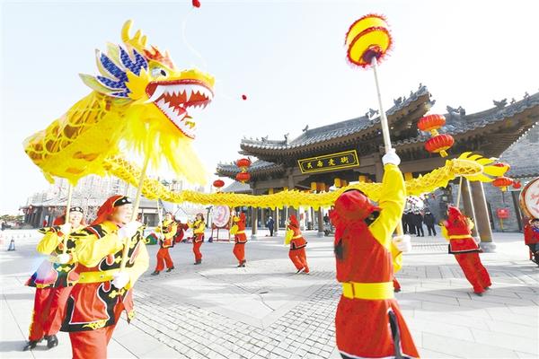 1月18日,由河南建业集团重资打造的周口建业关帝老街开街。该项目占地660亩,是我市重点文旅项目。该项目以明清豫东古建筑为设计风格,不仅再现了中原漕运重镇周家口“万家灯火牟江浦,千帆云集似汉皋”的深厚历史文化图景,还展示了周口沙颍河航运经济文化的复兴历史。关帝老街以“文化+旅游”模式开启了文旅商业的新篇章,成为对外展示周口形象的新名片、市民打卡的网红地(相关报道详见A2版)。记者 梁照曾 摄 开街仪式上的舞龙表演