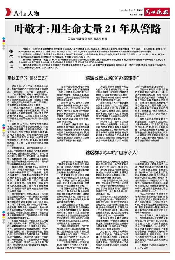 “自从警以来,叶敬才始终爱岗敬业、主动作为、业精技强,善于攻坚克难。他的心里装的永远都是工作,唯独没有他自己,直到走到生命的最后一刻。”西华县公安局副局长侯洪洲如此评价叶敬才。