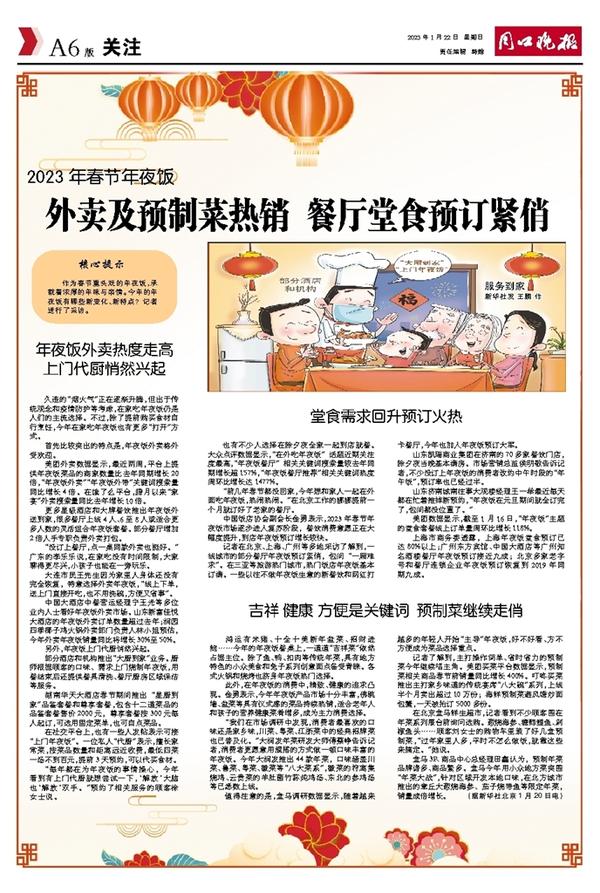 中国饭店协会副会长金勇表示,2023年春节年夜饭市场逐步进入复苏阶段,餐饮消费意愿正在大幅度提升,到店年夜饭预订增长较快。