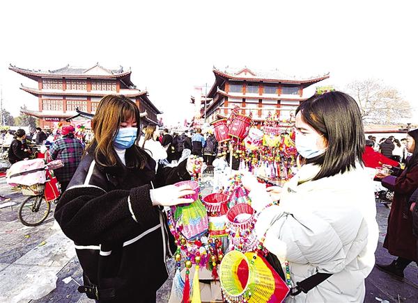 1月22日,游客们在淮阳区大年庙会上购买花篮。今年春节,周口各地消费、旅游市场人气大涨,人们逛庙会、品美食、逛集市等,开心至极,品味浓浓年味。记者 梁照曾 摄