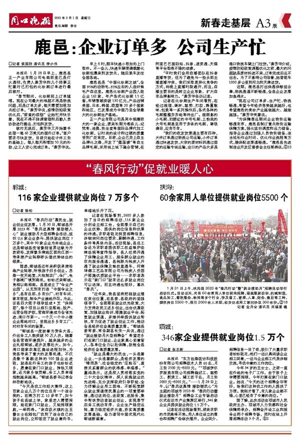 本报讯 “东方丝路医纺科技股份有限公司招聘技术人员60名,月工资2500元~8000元。”“项城梦尔罗服装有限公司招聘缝纫工、裁剪工、熨烫工、辅工若干名,月工资2000元~8000元。”……1月29日上午,以“春风送真情 援助暖民心”为主题的项城市2023年“春风行动暨就业援助月”招聘会工业专场启动仪式在该市产业集聚区举行,346家企业共提供就业岗位1.5万个。