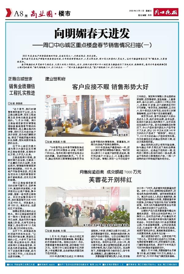 春节假期在欢声笑语中已经过去,大家又回到工作岗位。近日,本报记者对周口中心城区重点楼盘进行了实地走访,感触颇深。套用今年春晚歌曲《青山绿水》的歌词:“福气悄悄敲门口,开门好兆头……”周口重点楼盘的情况是:“客户悄悄涌门口,开门好兆头……”