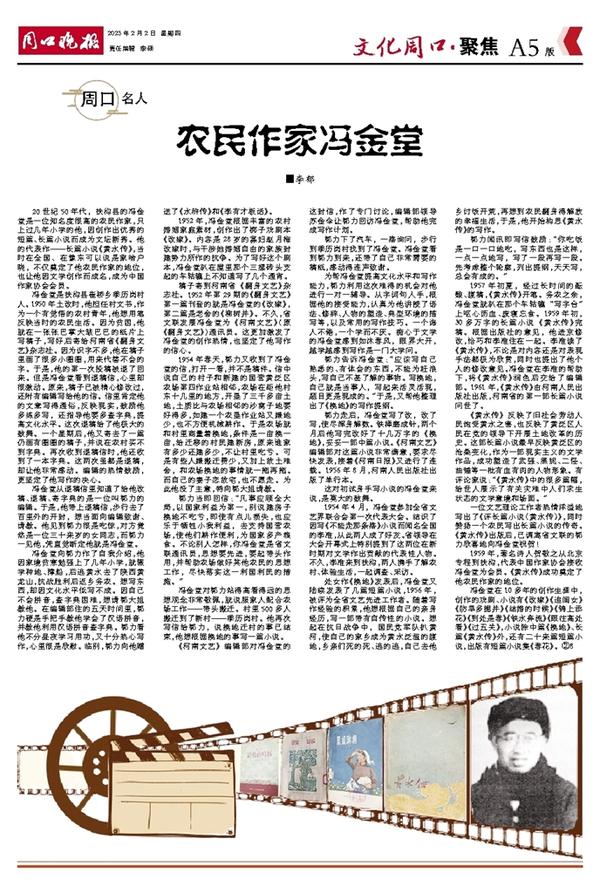 20世纪50年代,扶沟县的冯金堂是一位知名度很高的农民作家,只上过几年小学的他,因创作出优秀的短篇、长篇小说而成为文坛新秀。他的代表作——长篇小说《黄水传》,当时在全国、在豫东可以说是家喻户晓,不仅奠定了他农民作家的地位,也让他因文学创作而成名,成为中国作家协会会员。