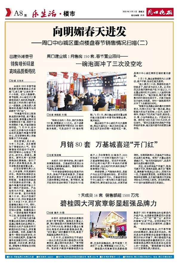 “今年借助疫情防控全面放开的东风,房地产市场逐渐复苏,万基城更是积极制定了3年以来项目最大力度的销售让利政策。春节期间,每天在没有活动的情况下自访约50组客户,1月份销售约80套房子,2023年完成了一个非常不错的开门红!”万基城销售经理说,项目开年热销,不仅让周口地产界3年来的不舒展得到抚慰,也让他们对未来的房地产形势增加了信心。