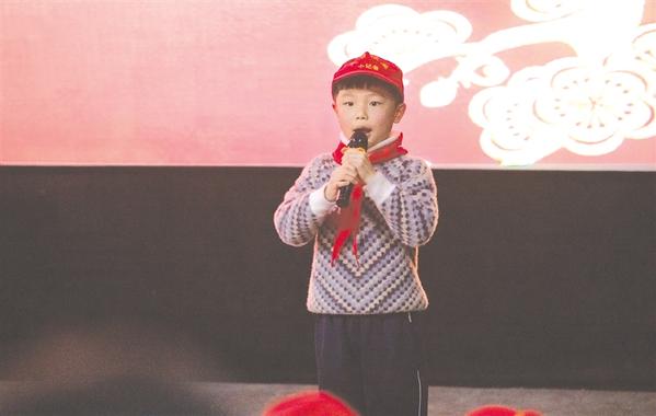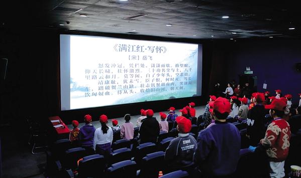 “怒发冲冠,凭栏处,潇潇雨歇……”影厅内,小记者肃然起立,集体朗诵古诗词《满江红》,随后,60名小记者逐一登台朗诵。澎湃激昂、热血沸腾的朗诵点燃了孩子们的报国热情。表现优秀的选手获得荣誉证书、奖品后,集体观看电影《满江红》。