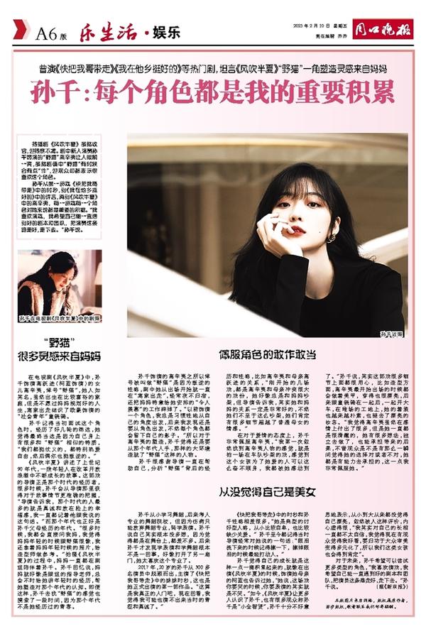 孙千从第一部戏《快把我哥带走》中的时秒,到《我在他乡挺好的》中的许言,再到《风吹半夏》中的高辛夷,每一部戏每一个角色对她来说都是重要的积累。“我喜欢演戏,我希望自己能一直遇到好的剧本和团队,把演员这条路走好,走下去。”孙千说。