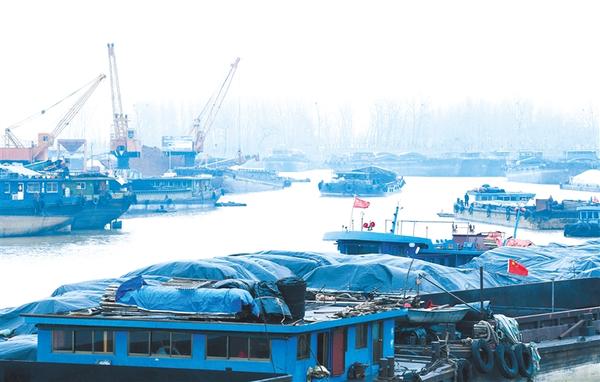 2月13日上午,在周口武盛大道跨沙颍河大桥东侧的周口益海航通物流码头内,进入码头的运煤车、拉粮食车来来往往,泊在码头边沙颍河内的货船连成片,颇为壮观。装满货物的货船起锚开拔,顺流而下,运往全国乃至全球各地。据了解,2022年我市港口共完成货物吞吐量3305万吨、集装箱吞吐量40646标箱,分别同比增长13.4%、51%。②2记者 梁照曾 摄