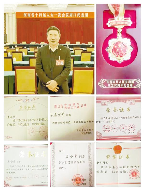 盖会章的功勋章里,有他自身的努力,也有妻子杨密芝的默默支持。盖会章耕种数千亩土地,一年四季忙不停。从种植前的准备到农作物收获、晾晒、出售,每个环节杨密芝都参与其中。为给丈夫减轻“负担”,杨密芝刻苦学习农业植保技术,搞好病虫害测报。几千亩农作物的防病治虫工作,都是盖会章驾机操作、杨密芝配药,确保粮食丰收。
