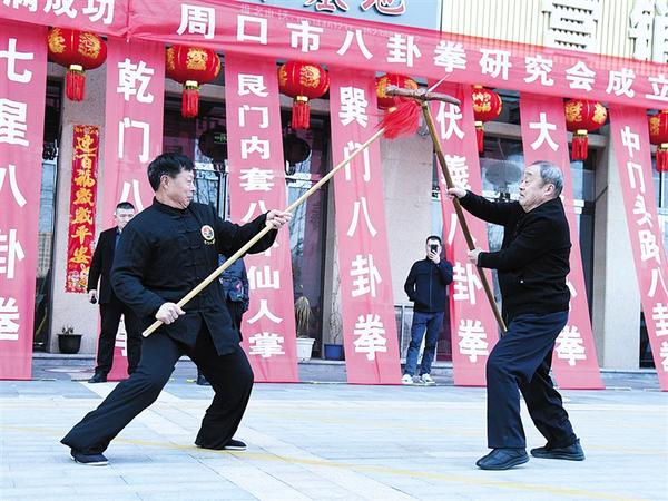 2月19日上午,八卦拳武术家们展示功夫。当日,周口市八卦拳研究会成立,周口市乾门八卦拳第五代传承人、著名武术家宋洪才当选为会长。来自全市的伏羲八卦拳、巽门八卦拳、艮门八卦拳、坎门八卦拳(商水县)、阴阳八卦拳等11家八卦拳门派的传承人及高手云集周口,共同见证这一庄严而神圣时刻。 记者 梁照曾 摄