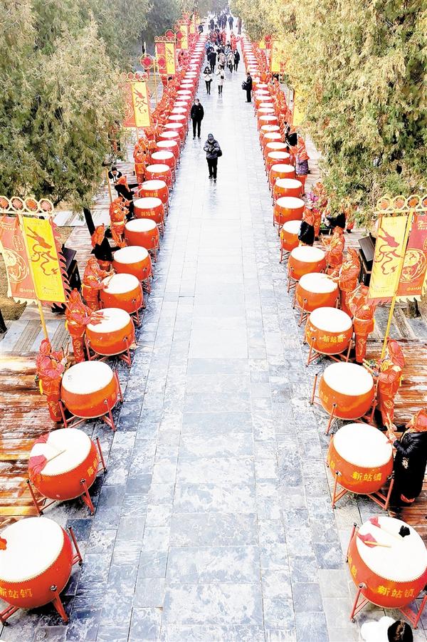 360面战鼓同时擂响,声似滚滚春雷。2月18日上午,在淮阳太昊陵景区,从午朝门到统天殿,鼓声阵阵,热闹非凡。为迎接即将来临的传统古庙会和第十三届“中原古韵——中国(淮阳)非物质文化遗产展演”活动,淮阳文化部门组织陈州战鼓队在景区热身,营造出浓厚的节日氛围。