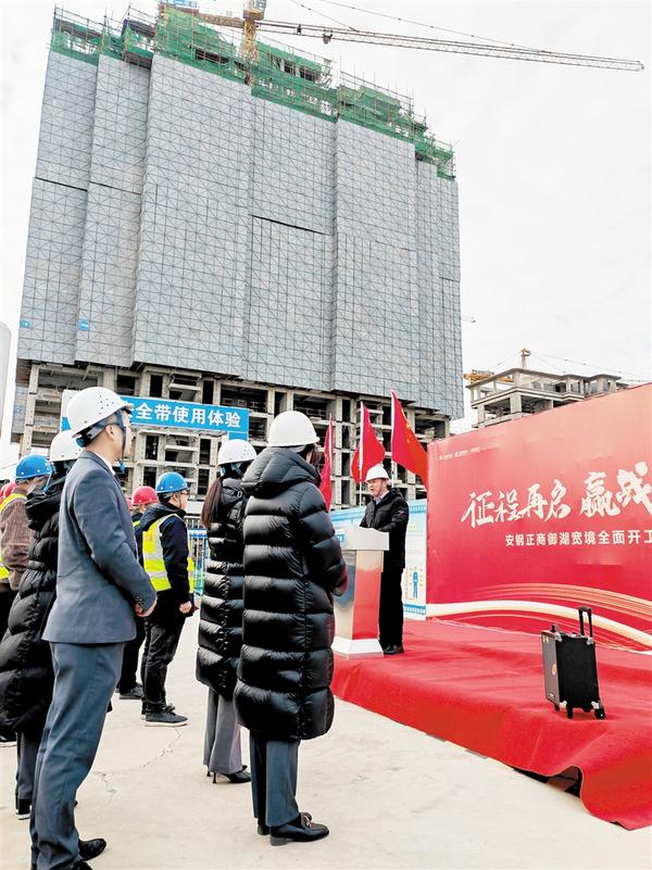 2月21日上午,周口市建筑工程质量标准化示范工地——安钢正商御湖宽境项目举行2023年新春复工仪式。图为复工仪式现场。