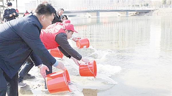 本报讯 初春时节,万物萌发。2月27日上午,位于项城市城区西北方向的吉祥湖公园一角人声鼎沸,热闹非凡。在众人瞩目中,一桶桶鱼苗被投入湖中,放归自然。