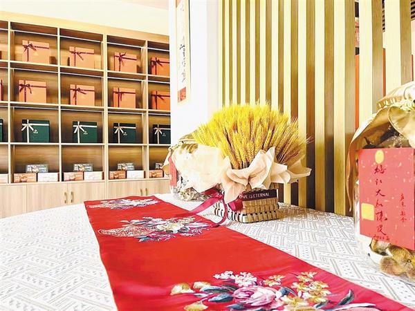 沈丘非遗会客厅以陈列非遗文创产品为主,墙面图文并茂详细介绍了沈丘非遗文化,与一旁的产品展示柜相映,便于让观众更直观地了解非遗文化,另外还有艺术家亲笔题名,增添了艺术气息。
