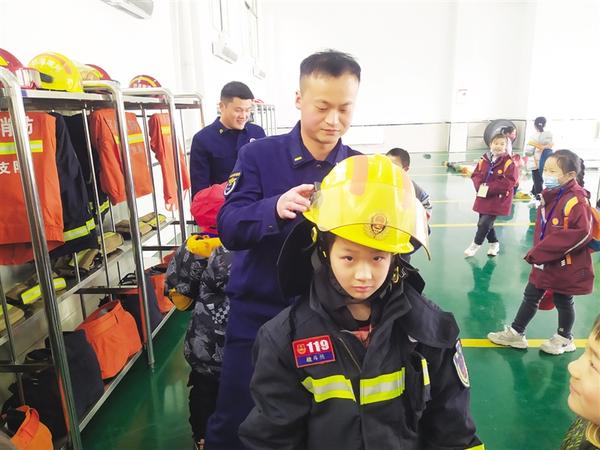 消防员防护服是保护消防员身体免受伤害的必备防火用具。几名小记者代表在消防员叔叔的帮助下试着穿上消防服、戴上头盔,体验了一回“小小消防员”。
