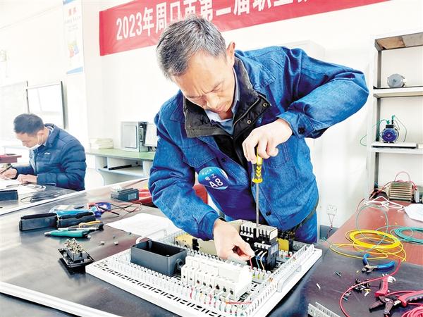 3月1日,参赛选手在赛场展示电器维修技能。当日,周口市第二届职业技能大赛在周口技师学院进行。本届大赛共有334名选手角逐15个比赛项目,其中院校选手276人、企业选手58人;参赛选手最小年龄16岁,最大年龄57岁,平均年龄27岁。据悉,本次大赛各赛项分别设立一、二、三等奖,并给予相应的物质奖励,各赛项的金奖选手将代表我市参加河南省第二届职业技能大赛。记者 刘华志 摄