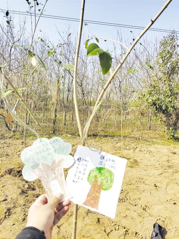 一派热火朝天的劳作之后,一排排海棠树苗“站”起来了。有的小记者将事前准备的心愿卡挂在小树苗上。“希望小树快点长大”“保护小树,人人有责”……一个个饱含真情的心愿卡随风摇曳。