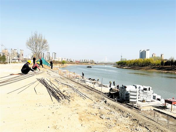 本报讯 3月14日,我市沙颍河水系城区综合治理建设项目——八一大道至健康路北岸堤防加固工程建设正如火如荼。在八一大道至健康路北岸,记者看到,挖掘机和清土运输车正进行作业;在八一大道桥向东河堤北岸,多名施工人员正裁剪钢筋……