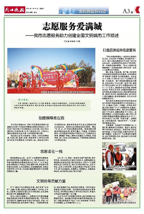 点滴善举,恰是城市文明细微之处,大爱汇聚,擦亮城市文明底色。现如今,散步在周口田间地头,舒适宜人、鸟语花香;行走在城市街道,人车各行其道,交通井然有序,环境干净整洁。这离不开广大志愿者的辛勤劳动,他们用亮丽的风采,推动城市文明向更高层次迈进。①6