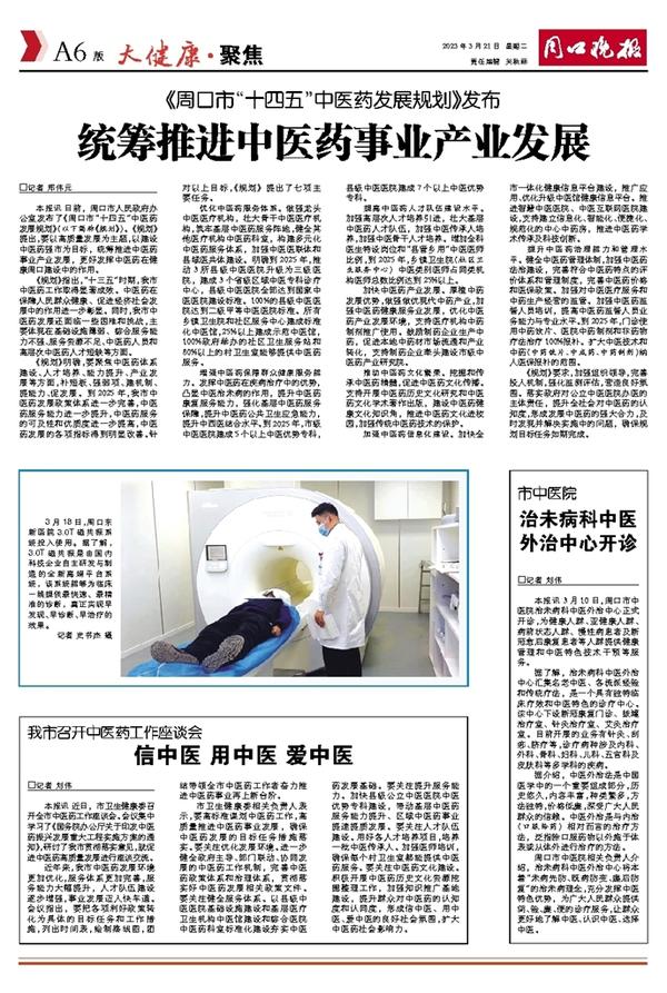 本报讯 3月10日,周口市中医院治未病科中医外治中心正式开诊,为健康人群、亚健康人群、病前状态人群、慢性病患者及新冠愈后康复患者等人群提供健康管理和中医特色技术干预等服务。