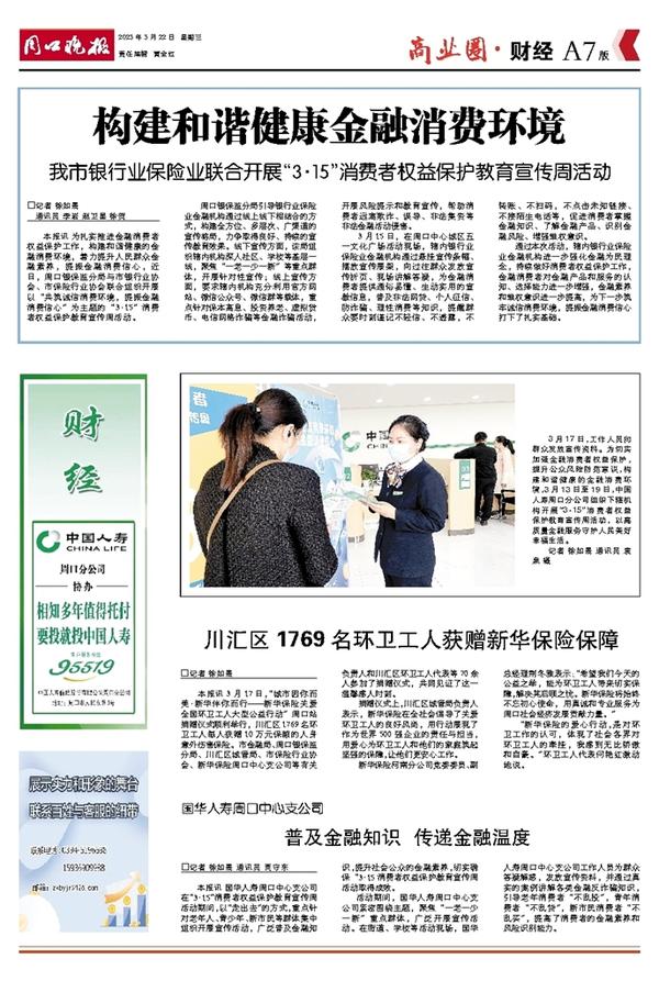 本报讯 为扎实推进金融消费者权益保护工作,构建和谐健康的金融消费环境,着力提升人民群众金融素养,提振金融消费信心,近日,周口银保监分局与市银行业协会、市保险行业协会联合组织开展以“共筑诚信消费环境,提振金融消费信心”为主题的“3·15”消费者权益保护教育宣传周活动。