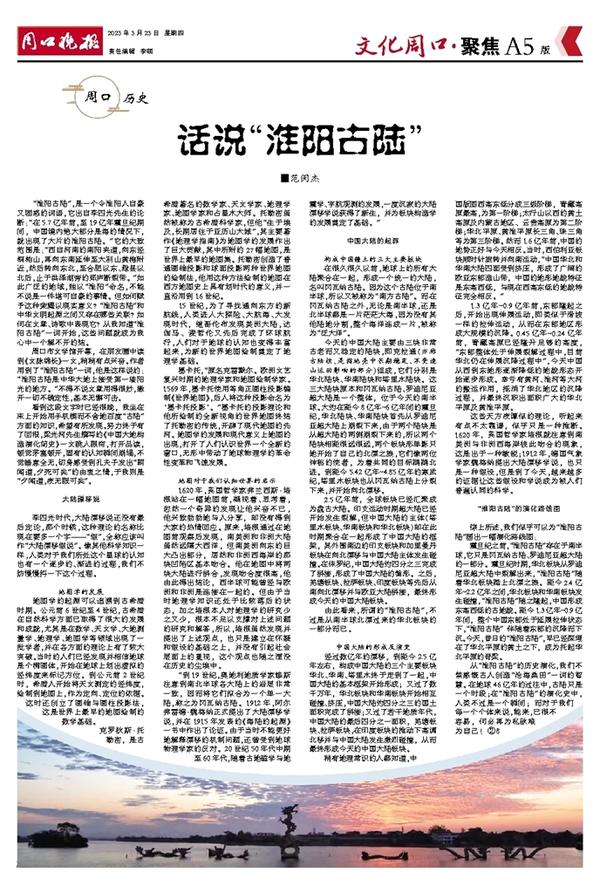 震旦纪之前,“淮阳古陆”存在于南半球,它只是冈瓦纳古陆、罗迪尼亚超大陆的一部分。震旦纪时期,华北板块从罗迪尼亚超大陆中裂解出来,“淮阳古陆”随着华北板块踏上北漂之旅。距今2.4亿年~2.2亿年之间,华北板块和华南板块发生碰撞,“淮阳古陆”随之隆起,中国形成东高西低的古地貌。距今1.3亿年~0.9亿年间,整个中国东部处于延展拉伸状态下,“淮阳古陆”伴随着东部的沉降而下沉。今天,昔日的“淮阳古陆”,早已经深埋在了华北平原的黄土之下,成为托起华北平原的脊梁。