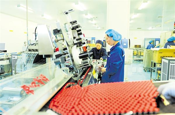 3月30日,郸城县百年康鑫药业抗病毒口服液技改车间员工正在生产作业。据悉,郸城县坚持“项目为王”,加大重点项目推进力度,以科技创新为重点项目建设赋能、实现生产效能翻番,助力高质量发展。③6记者 徐松 摄
