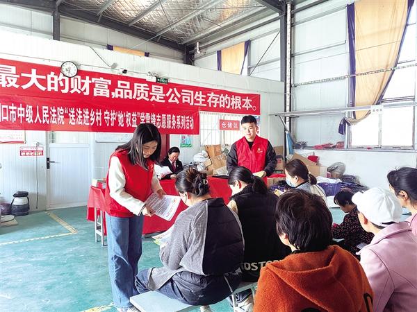 本报讯 为切实增强广大农村妇女的法律意识和维权意识,弘扬无私奉献的雷锋精神,持续开展“学雷锋志愿服务月”活动,近日,周口市中级人民法院党组成员、副院长张冬梅带领普法宣讲员和党员志愿者,走进郸城县胡集乡大任庄行政村,深入扶贫车间一线,开展“送法进乡村 守护‘她’权益”学雷锋志愿服务系列活动,为车间女职工带去一场生动的普法教育课。